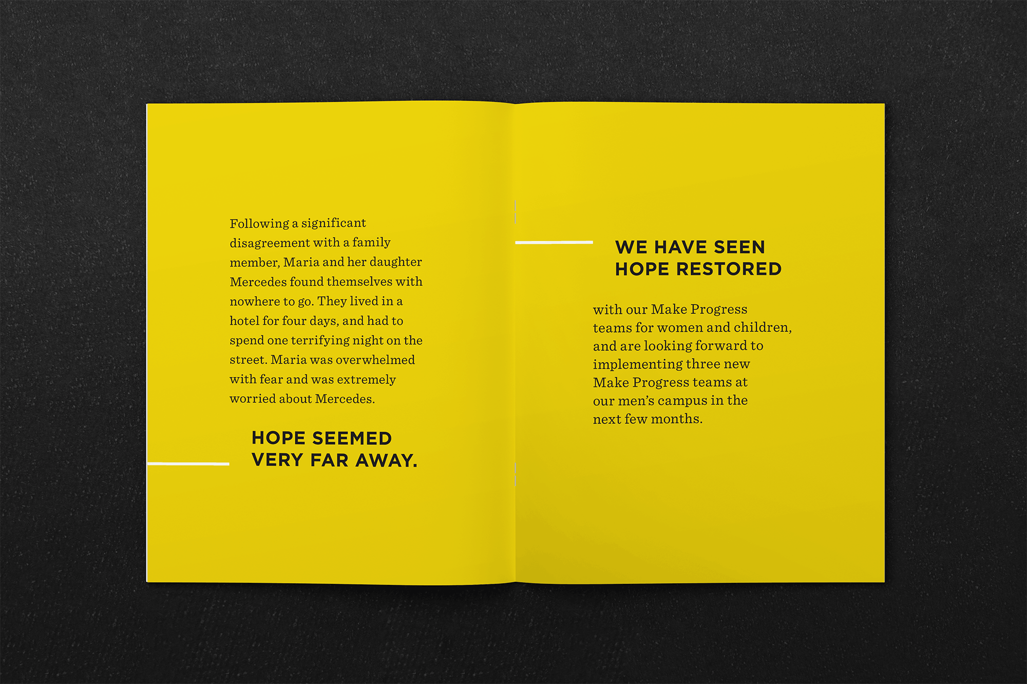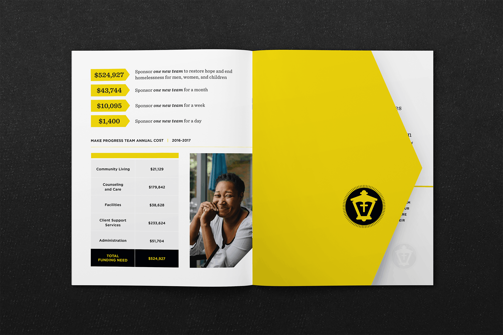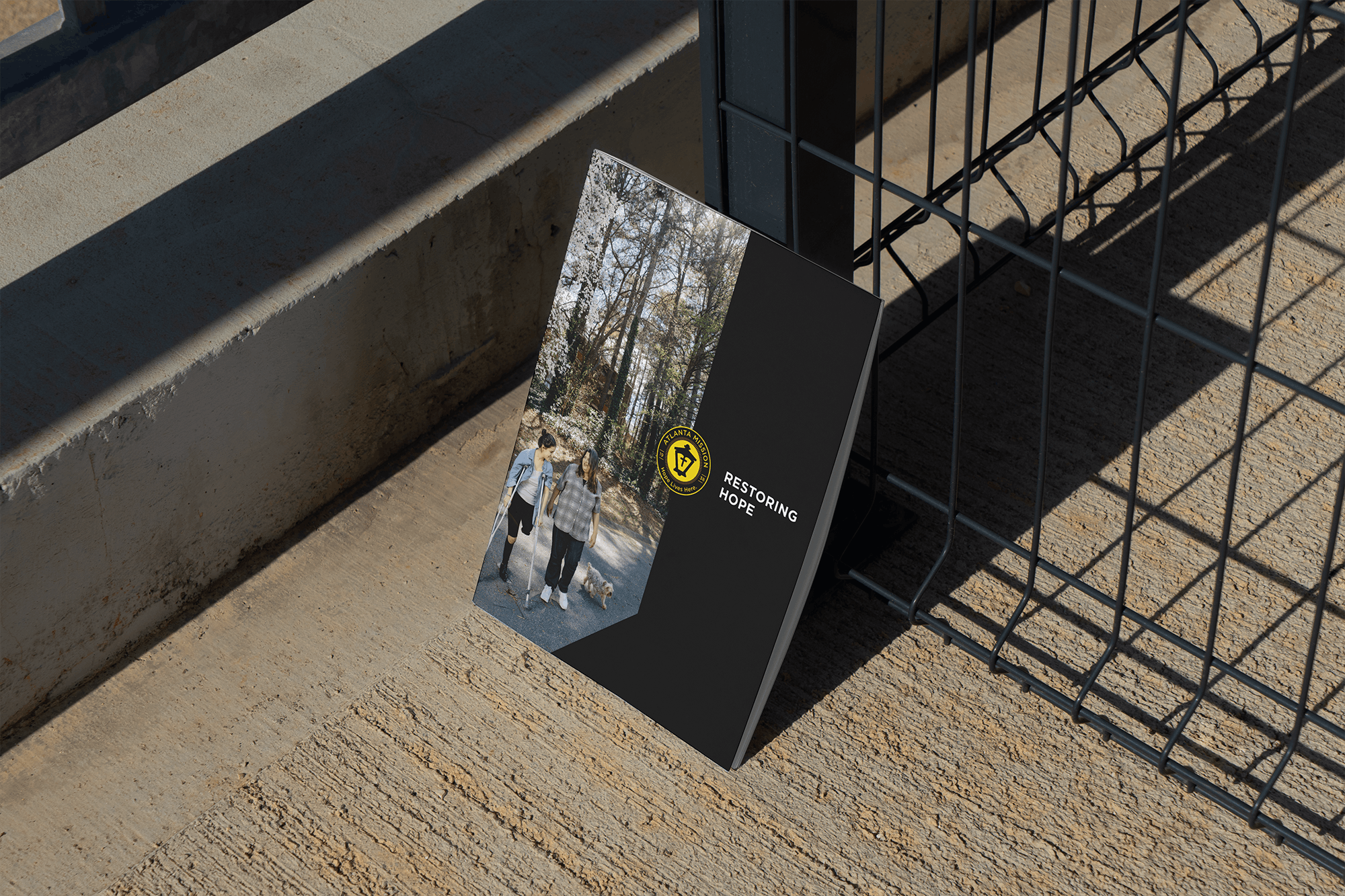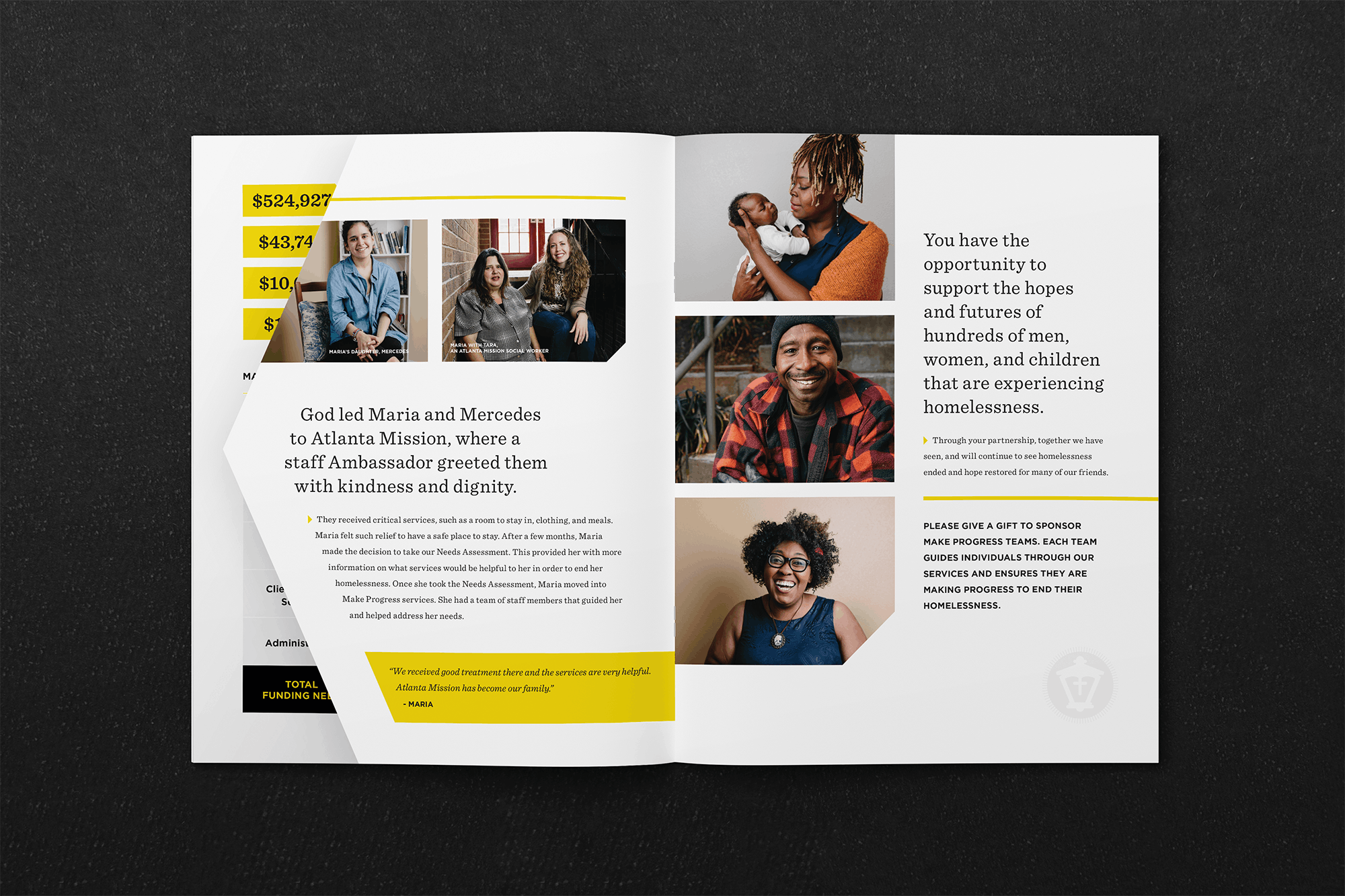 The campaign featured bright, uplifting imagery, with themes of movement and progress woven throughout. A standout design element was an arrow-shaped die-cut page, adding dynamic visual interest. The booklet was anchored by a bold black-and-gold color palette and a distinctive logo, symbolizing Atlanta Mission as both a safe haven for the city's most vulnerable and a beacon of hope on the path to recovery.