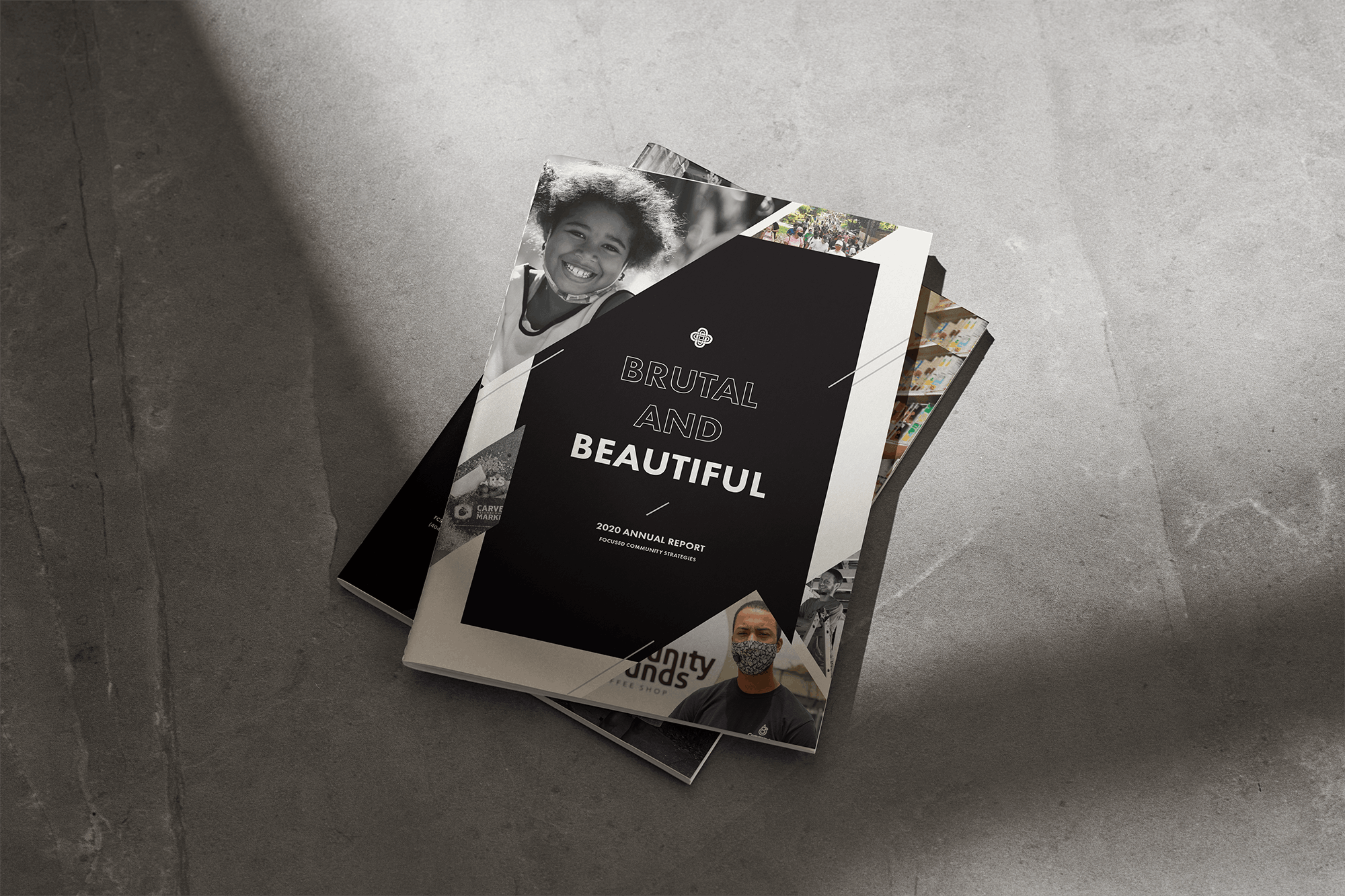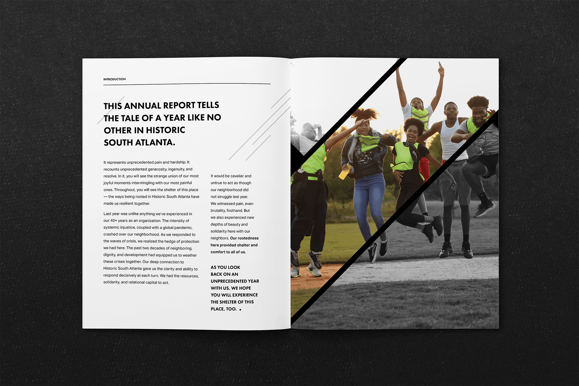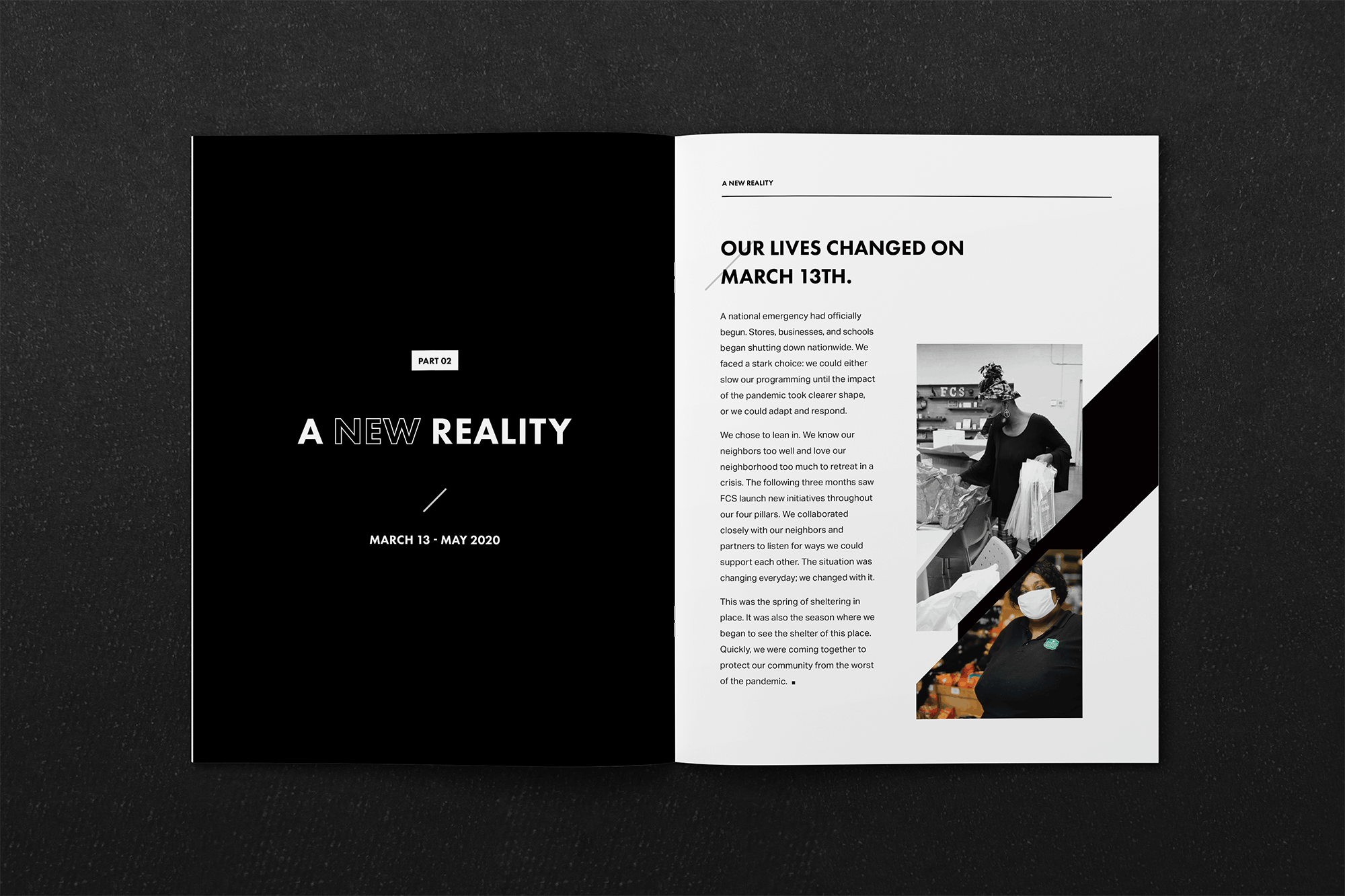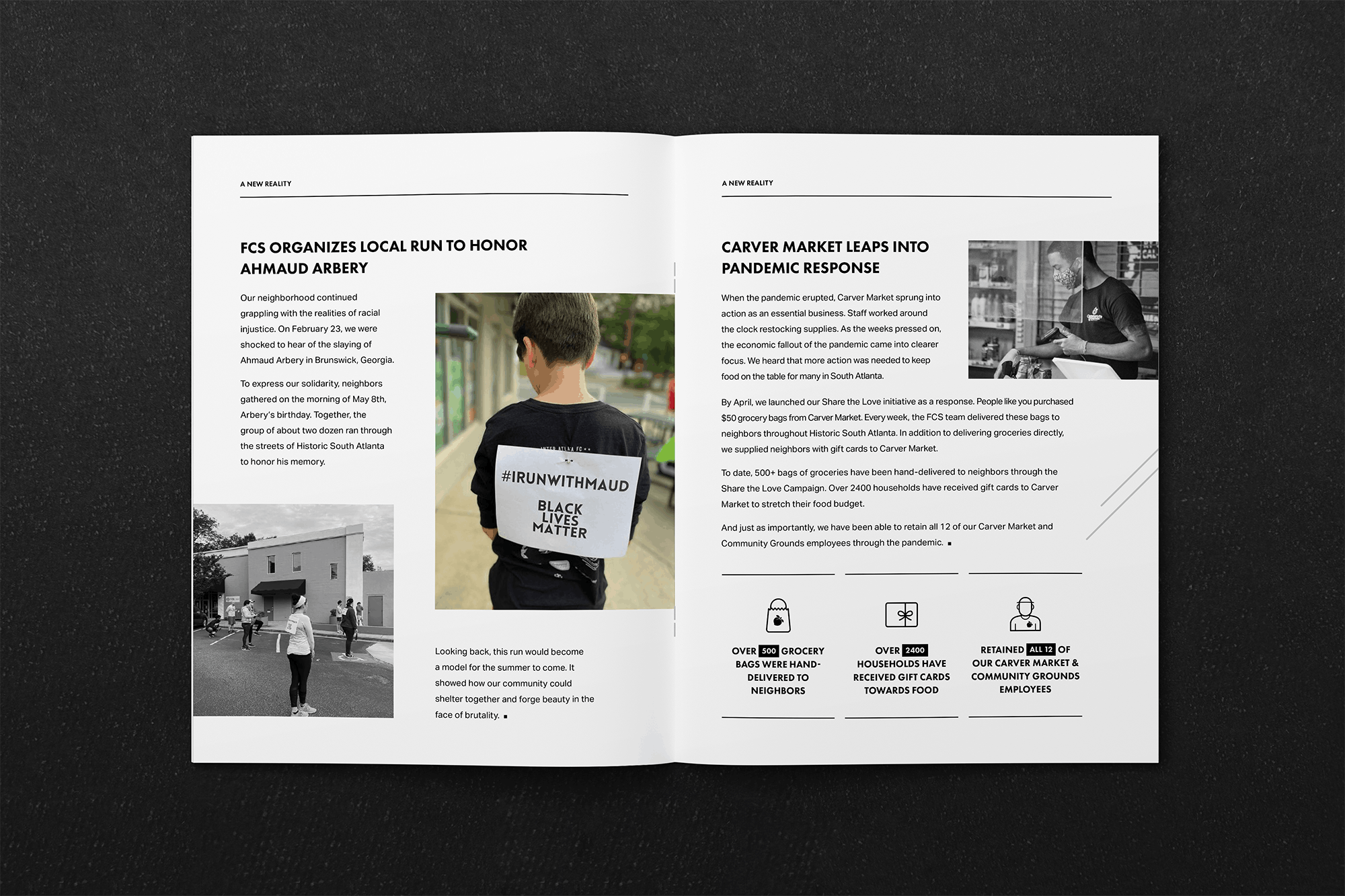 This report aimed to capture these themes of struggle, resilience, and unwavering support within the community. The booklet uncomfortably conveyed this theme through shifting blocks, misalignment, and moving lines, symbolizing the transformation. Stripping away their usual vibrant brand colors, the design focused on a tonal black-and-white palette, allowing images to provide the only color and letting white space carry the narrative with minimal distractions.
